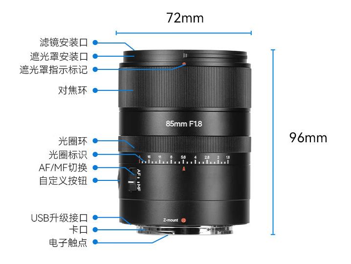 其中心锐度落在0.86左右,和七工匠的85 1.8比较类似。滤镜尺寸62mm,最近对焦距离0.8m,重量510克,支持E口和Z口,估计X口不久也会有的。