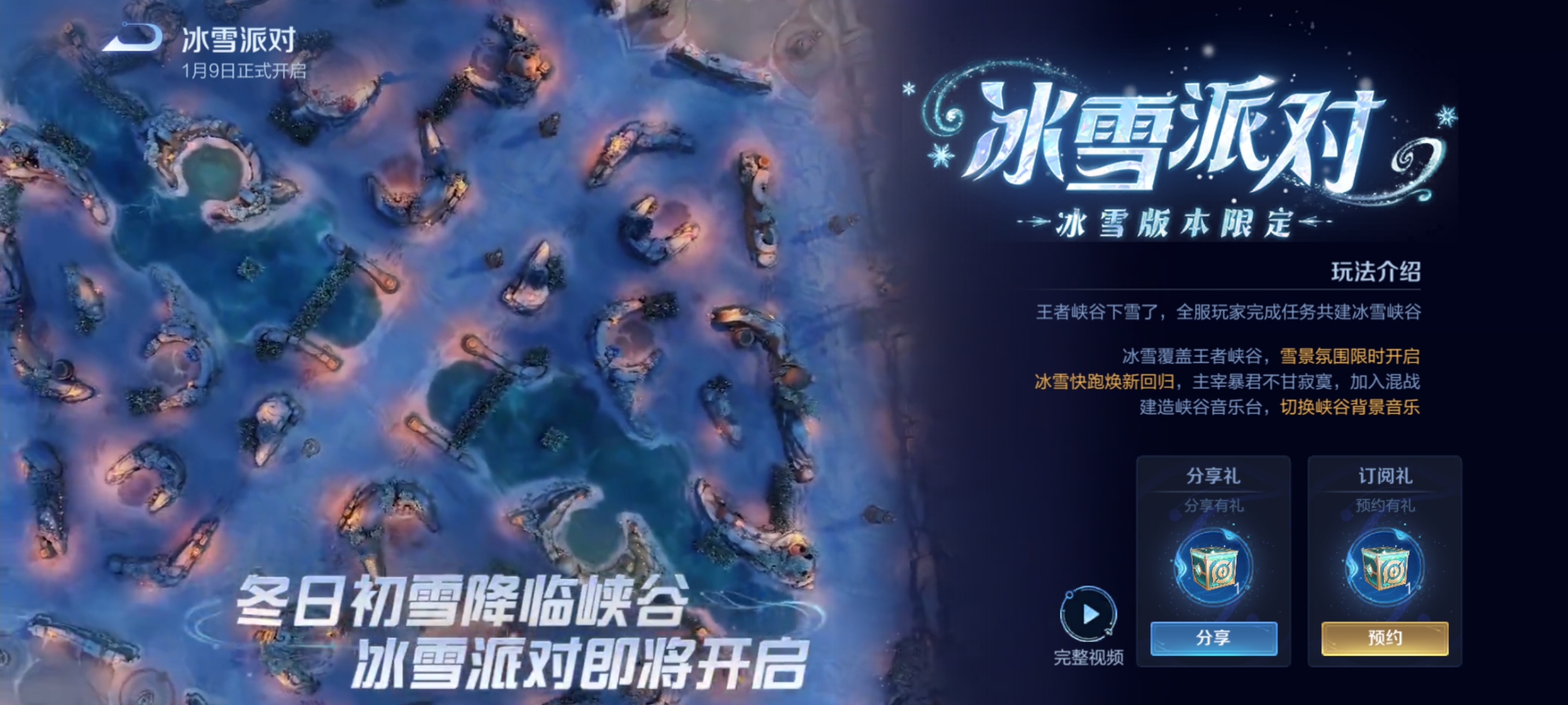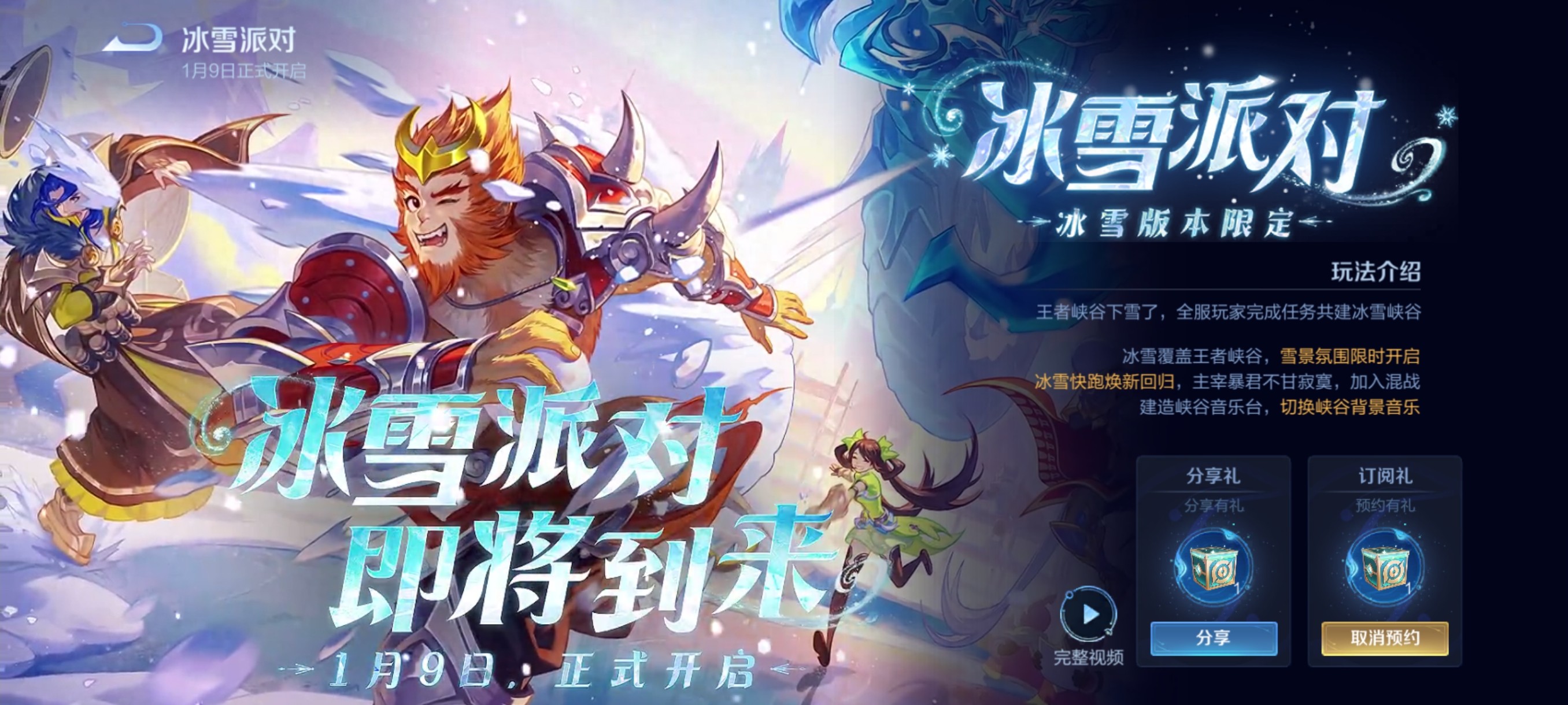 王者荣耀正式服已开启冰雪派对的预约活动,在活动界面可以清晰的看到, 冰雪派对将在1月9日正式开启 。这也意味着正式服将在本周进入冰雪主题版本,并且还会上线一个冰雪大地图、冰雪快跑玩法,以及一款冰雪新皮肤。我们一起来看看最新情况: