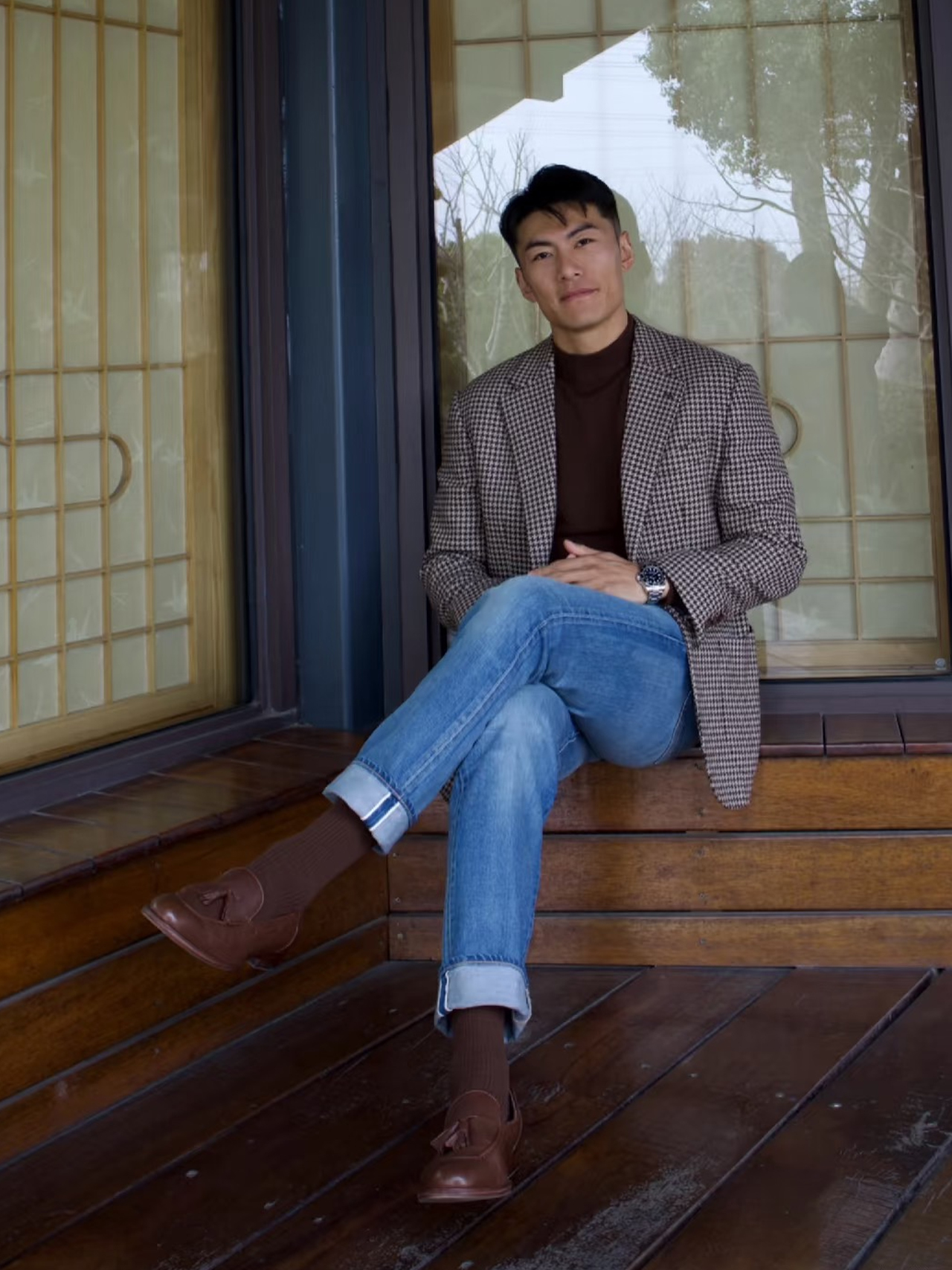 复古格纹西装内搭毛衣,下半身搭配牛仔裤和皮鞋, 袜子与皮鞋选择同色系,纵向延伸视觉更有利于显腿长,干净整洁很有魅力!
