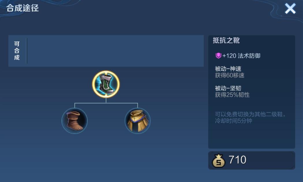 抵抗之靴: 有法防且降低被控时间, 可以克制控制类英雄 ,提高反制概率。 适合反制控制类英雄,比如对面有王昭君、墨子、刘禅等控制强的英雄。