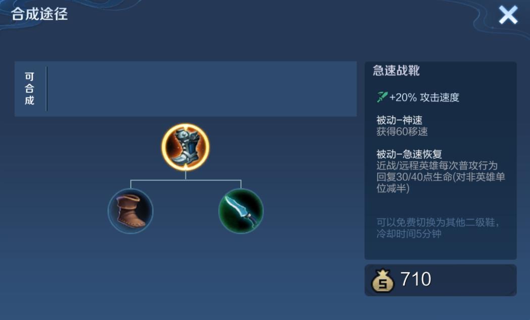 急速战靴: 增加攻速和固定回血,在线上有增加续航的作用, 只适合普攻类英雄使用,基本就是射手的专属鞋子了。