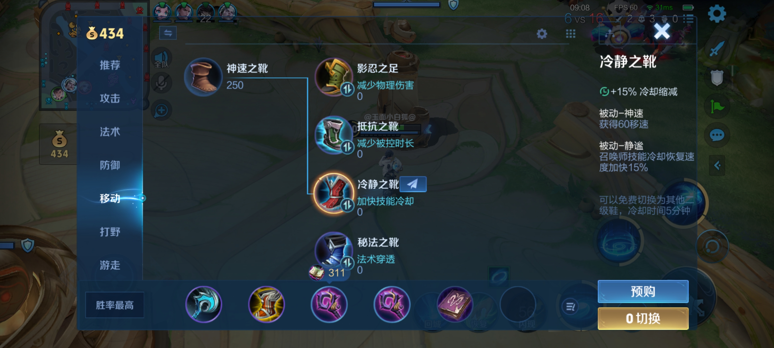 3、 中单 为了追求游走效率,出了疾步之靴,参团之后换成 秘法之靴或冷静之靴。