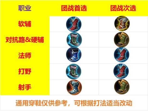 前期按照情况所需选择对线的鞋子,比如: 游走出疾步之靴、增伤出秘法之靴或急速战靴、CD长出冷静之靴、抗压出影忍之足 ,中后期可根据公式直接换鞋。如果实在怕难换,套用公式鞋就行,不过逆风时不好打。