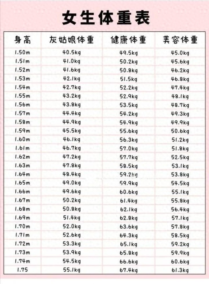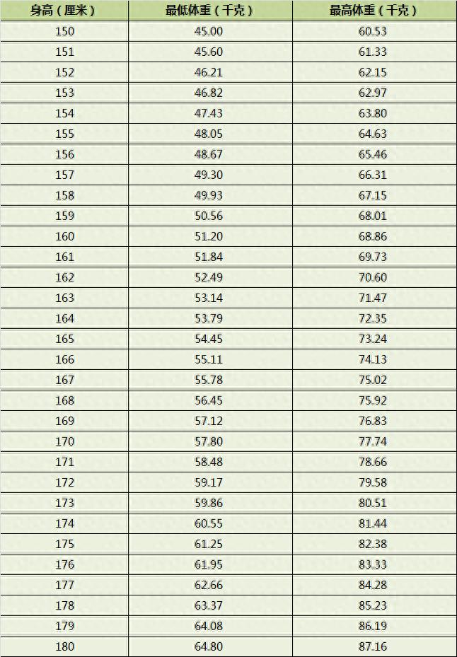 不同身高的男女,多少斤算胖? 我们来看看这一份身高、体重对照表,看看你是否属于肥胖?