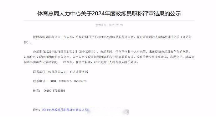 体育总局人力中心关于2024年度教练员职称评审结果的公示