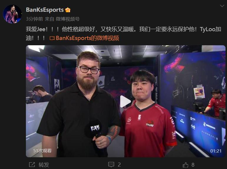 被Jee喂冰激凌的主持人Banks为此特意更新了自己的中国社媒,他写道:“我爱Jee!!!他性格超级好,又快乐又温暖。我们一定要永远保护他!TyLoo加油!!!”