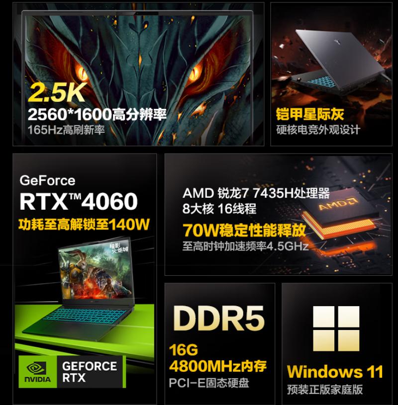 此外是16GB DDR5 4800MHz内存,双插槽,512GB M.2 SSD。显卡是RTX4060,标注140W性能释放。屏幕是16英寸,2560x1600像素,165Hz高刷,100% sRGB色域。