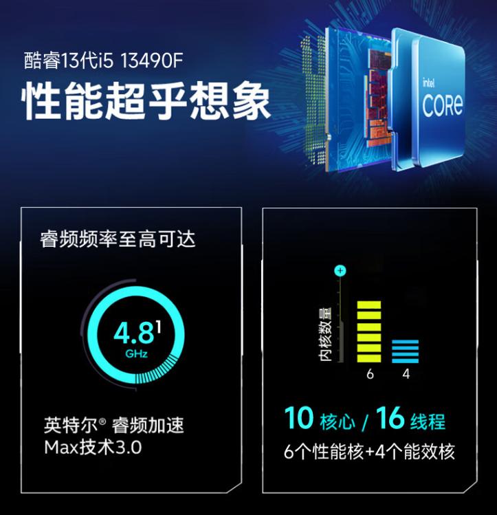 这款电脑型号是暗影骑士焕V70,采用了i5-13490F处理器,6个性能核心,4个效能核心,10核,16线程,最大睿频4.8GHz,65W功耗,无集成显卡。