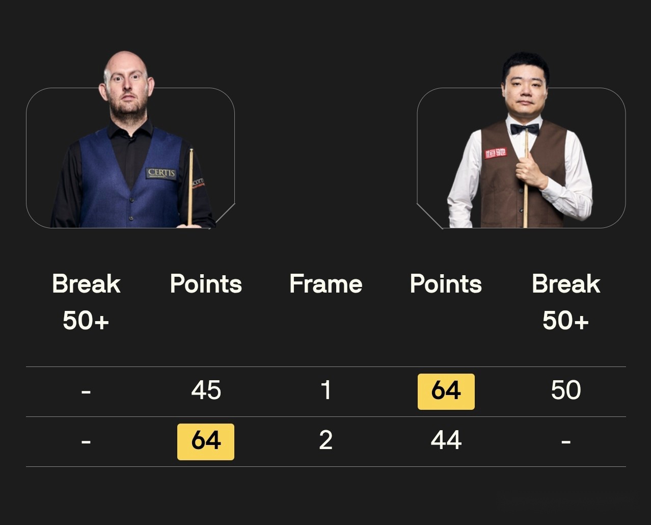 第二局比赛双方焦灼后丁俊晖上手拿下44分后将机会让出,塞尔特最终还是64比44拿下第二局,双方回到同一起跑线。