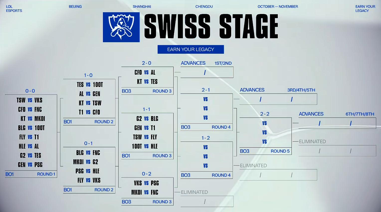 10月17日将进行2-0组的比赛(比赛为BO3),胜者直接晋级八强。10月18日进行1-1组的比赛(继续BO1分组),10月19日进行0-2组的比赛(比赛为BO3),败者惨遭淘汰。