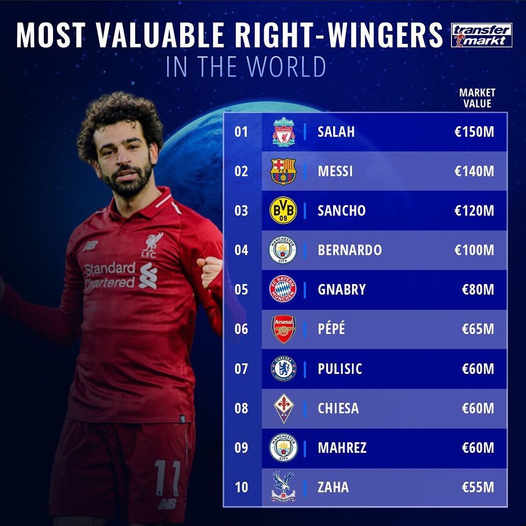 德转近日制作了右边锋身价排行榜,萨拉赫以1.5亿欧元的身价排名榜首,梅西1.4亿欧元紧随其后,桑乔以1.2亿欧元的身价位列第三。