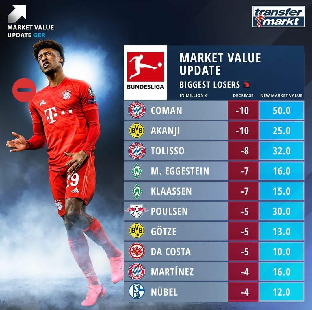 德国转会市场网站本月更新了德甲球员的身价,多特蒙德中卫阿坎吉、拜仁边锋科曼身价均缩水1000万欧元,下跌幅度德甲最高。拜仁中场托利索身价下跌800万欧元,跌幅排在第三位。