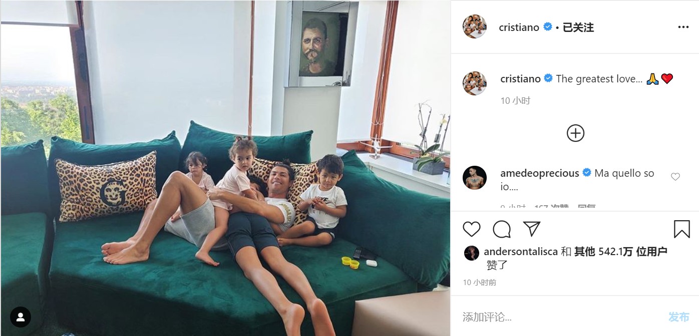 C罗晒出自己带着四个娃的照片,并配文写到:“这是最伟大的爱。”还配上了祈祷和爱心的表情。