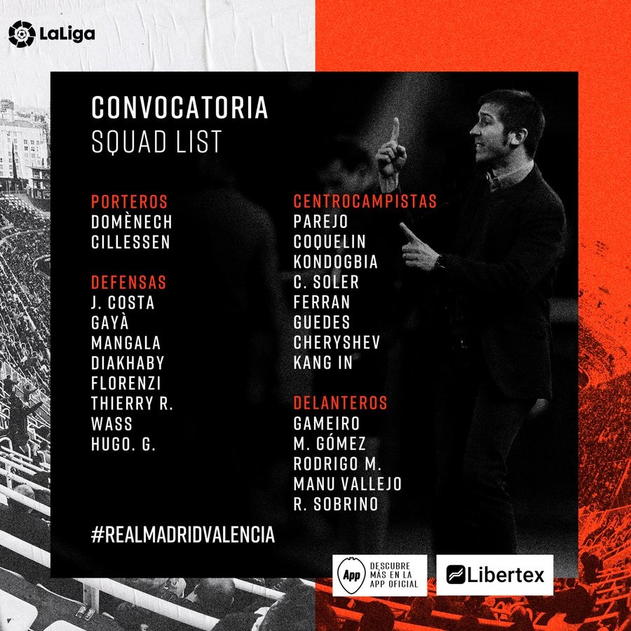 瓦伦西亚官方公布了出战当地时间周四客场与皇家马德里的西甲联赛的大名单。