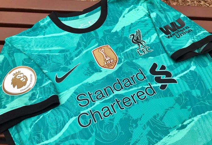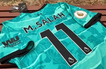 在社交媒体上,一位博主放出了球员版本的利物浦下赛季客场球衣。这位博主放出的照片中,球衣正面有世俱杯冠军徽章,侧面有英超袖标,背后则是萨拉赫的印号和名字。球衣主体部分为绿松石色,带有充满设计感的花纹。袖口和领口及其他细节处都用了黑色。不同于主场球衣的V领,客场球衣使用的是圆领。