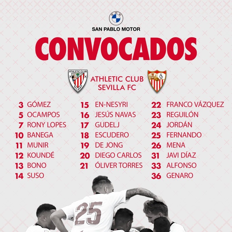 塞维利亚官方公布了出战当地时间周四客场与毕尔巴鄂竞技的西甲联赛的大名单,孔德解禁复出,瓦茨利克缺阵。