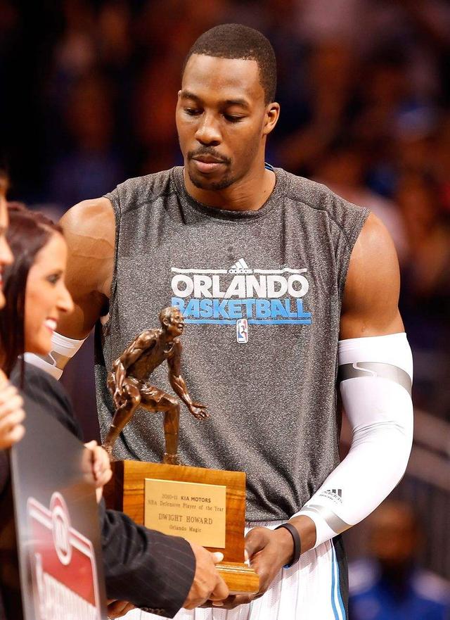 当然,除了篮板之外,霍华德的防守是非常出色的,这使得他连续三年拿到了最佳防守球员(联盟历史上第一个达到此成就的球员)。当然,这也得益于他出色的弹跳能力以及移动能力。我们甚至可以这么说,以霍华德的能力,他可以一个人覆盖三秒区的防守,这使得在四号位防守力量明显不足的情况下,魔术队的内线防守依然没有出现太大的问题,这正是得益于霍华德在防守端的。