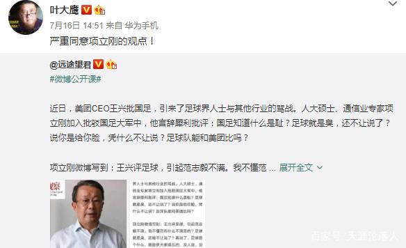 之后在和网友互动的时候,叶大鹰表示:我还真不知道这个人(人大硕士项立刚),就觉得他说的有道理。就事论事,中国足球那么臭被人骂几句怎么了?一帮所谓的“国脚”牛逼哄哄的一副得罪不起的样子,有本事拿成绩来回答呀。你说对吧?